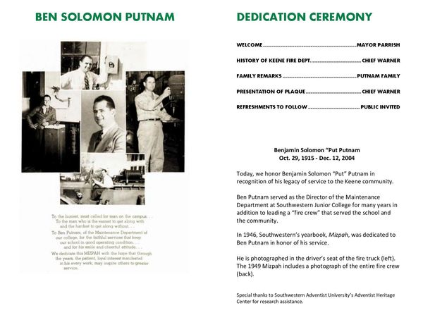 The 1946 Mizpah Yearbook (as featured in the fire station pamphlet) from Southwestern Adventist University was dedicated to BEN PUTNAM, father to Jere "Bugger" Putnam. It was a fitting tribute to an honorable man.