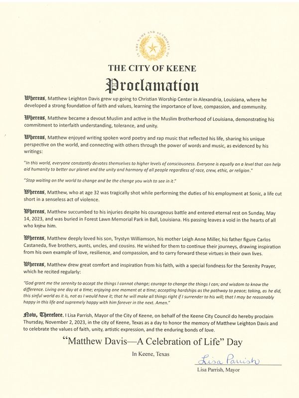 "Whereas Matthew Leighton Davis grew up going to Christian Worship Center in Alexandria, Louisiana, where he developed a strong foundation of faith and values, learning the importance of love, compassion and community," Mayor Parrish read. "November 2, 2023, in the city of Keene, Texas, as a day to honor the memory of Matthew Leighton Davis."